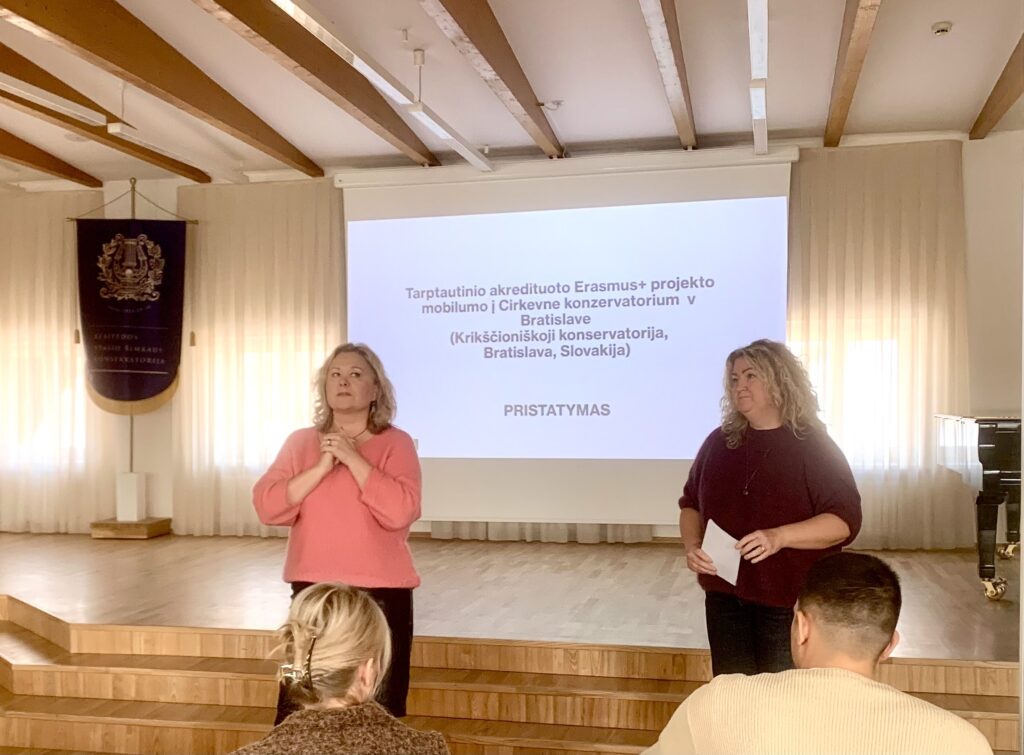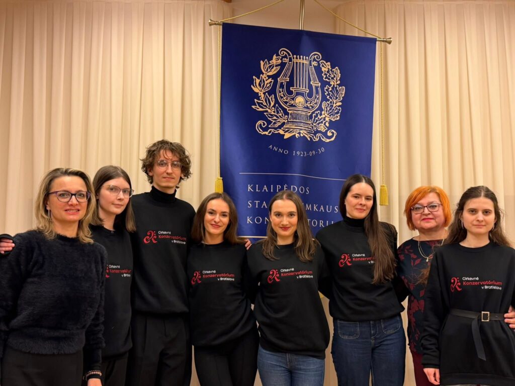 | Erasmus+ mobilumas Bratislavoje (Slovakija) Klaipėdos Stasio Šimkaus konservatorija jau ne vienerius metus vykdo „Erasmus+“ akreditacijos projektus, kurių dėka tiek mūsų mokyklos pedagogai, tiek mokiniai gali vykti į įvairias Europos šalis su stebėjimo ar mokymo (dėstymo) vizitais. Spalio 16 d. dvi pedagogės: Giedrė Zeicaitė ir Živilė Čapienė (mokymo (dėstymo) mobilumas), konservatorijos direktorė Renata Krikščiūnaitė-Barcevičienė (stebėjimo mobilumas) bei 6 mūsų mokyklos moksleiviai vykome į Slovakiją, Bratislavos krikščioniškąją konservatoriją (Cirkevné konzervatórium v Bratislave). Mūsų vizitas tęsėsi 10 dienų. Savo kelionę pradėjome ankstyvą spalio 16-osios rytą patogiu jungiamuoju skrydžiu Palanga-Ryga-Viena, vėliau autobusu iki Bratislavos. Nukeliavus į Bratislavos krikščioniškąją konservatoriją, mus šiltai pasitiko mokyklos administracija. Prie puodelio kavos domėjomės vieni kitų mokymosi įstaigomis, mokymo organizavimo panašumais ir skirtumais. Po susitikimo mums pravedė ekskursiją po mokyklą, papasakojo jos istoriją, aprodė auditorijas, koplyčią, renginių salę. Kadangi sekančią dieną mūsų laukė bendras koncertas su slovakais, mokiniai gavo auditorijas savarankiškiems užsiėmimams ruošiantis atsakingam renginiui. Ištaigingo Muzikos namų pastato (Domu hudby) Bratislavos senamiestyje jaukioje pilnutėlėje salėje prisirinko garbingų svečių. Vyko koncertas „Muzika be sienų“, skirtas tarptautinei Erasmus+ dienai paminėti. Kartu su slovakų atlikėjais muzikavome ir atlikome savo šalies muziką, mes reprezentavome Lietuvą, o jie-Slovakiją. Mūsų nuostabai iš mūsų mokinių ir direktorės buvo imami interviu, susuktas gražus informatyvus filmukas buvo transliuojamas per kelias Slovakijos televizijas. Po sėkmingo koncerto sekančią dieną aplankėme Bratislavos miesto senamiestyje esančią įspūdingą XV a. keturių bokštų pilį, apžiūrėjome joje esančias architektūros ir bažnytinio paveldo ekspozicijas, pasivaikščiojome po pilies sodą, apsilankėme Šv. Martyno katedroje. Vėliau klaidžiojome gražiomis senamiesčio gatvelėmis, kažkiek panašiomis į mūsų Vilniaus, paragavome tradicinių slovakiškų patiekalų. Mes turėjome puikią galimybę savo laisvomis savaitgalio dienomis aplankyti Vieną, nes atstumas buvo tik viena valanda kelio. Mes, žinoma, tuo pasinaudojome ir spalio 18 dieną autobusu nuvažiavome į Austrijos sostinę. Išsianalizavę metro maršrutus, atkeliavome į Vienos centrą. Prieš mūsų akis iškilo didinga Vienos katedra ir įspūdingas senamiestis. Nuskubėjome į Šv. Augustino bažnyčią, kurioje vyko iškilmingos mišios, skirtos Šv. Mergelei Marijai, ir skambėjo orkestro, choro ir solistų atliekamos nuostabaus grožio J. Haidno mišios „Schopfungsmesse“. Po mišių užsukome į labai gražią miesto biblioteką, apsilankėme žymiajame Vienos turgelyje (Getraidemarkt). Dienos kulminacija buvo apsilankymas Vienos „Raimund Theater“, A. L. Veberio miuzikle „Operos fantomas“. Sužavėjo miuziklo pastatymas, atlikimas ir scenografija. Pakylėti ir įkvėpti didingo meno patraukėme vakarėjančios Vienos gatvelėmis link autobusų stoties-juk dar turėjome grįžti į Bratislavą. Nuo pirmadienio kibome į atsakingas ir svarbias veiklas, patobulinome savo anglų kalbos žinias bendraudami su konservatorijos pedagogais ir administracija anglų kalba. Spalio 20 d. rytas Bratislavos Krikščioniškoje konservatorijoje prasidėjo pilnoje koncertų salėje nuo mūsų konservatorijos pristatymo. Direktorė Renata Krikščiūnaitė-Barcevičienė išsamiai papasakojo ir vizualiai pristatė mūsų mokyklos įkūrimo istoriją, veiklą, pasiekimus, ugdymo plano ypatumus. Klausytojams buvo įdomu girdėti apie Lietuvos specializuoto ugdymo išskirtinumą, lyginant su jų šalyje vykdomu meniniu ugdymu. Spalio 21 d. mokytoja ekspertė Živilė Čapienė pristatė lietuvių fortepijoninės muzikos raidą, jos ištakas ir vystymąsi. Klausytojai turėjo galimybę išgirsti keletą lietuvių kompozitorių fortepijoninių kūrinių. Mokytoja pristatė ir savo aranžuotų Gedimino Purlio fortepijoninių kūrinių rinkinį. Po išsamaus pranešimo prasidėjo mokytojos Živilės Čapienės meistriškumo pamokos Bratislavos konservatorijos fortepijono skyriaus mokiniams, kurios tęsėsi dvi dienas. Spalio 22 d. mokytoja ekspertė Giedrė Zeicaitė dirbo su vokalo skyriaus mokiniais (vedė meistriškumo pamokas). Džiugu, kad tą dieną renginyje apsilankė garsi dainininkė, buvusi šios konservatorijos dainavimo pedagogė, lietuvė Lili Deksnytė-Larina. Renginį vainikavo mūsų konservatorijos dainavimo skyriaus veiklos pristatymas. Mokytojai Giedrei Zeicaitei talkino mūsų mokinys Karlas Gedgaudas. Džiaugiamės, kad galėjome pasidalinti savo patirtimi, anglų kalba pristatydami mūsų Konservatorijos veiklą, pasiekimus ir vesti meistriškumo kursus. Sulaukėme didelio Bratislavos Krikščioniškosios konservatorijos bendruomenės susidomėjimo. Per visą Erasmus+ savaitę Bratislavoje turėjome galimybę ne tik dalintis patirtimi, bet ir pagilinti savo kompetencijas stebėdami puikių pedagogų darbą su savo ir mūsų mokiniais. Aplankėme fortepijono, klasikinio dainavimo, gitaros, fleitos, vargonų, operos studijos pamokas. Žavėjomės mokytojo ir mokinio šiltu betarpišku santykiu, profesinėmis žiniomis, meistriškumu, didele pagarba muzikos menui. Šiuos įspūdžius papildė koncertų lankymas ištaigingose salėse. Turėjome galimybę klausyti kamerinės muzikos festivalio (2025-10-14–21), skirto čekų kompozitoriui Bohuslav Martinu, finalinį koncertą ypatingo grožio Moyzes koncertų salėje, kur koncertavo pasaulinio garso pianistas, dirigentas, apdovanotas Grammy, Olli Mustonen. Kitą dieną lankėmės jo meistriškumo pamokose su jaunaisiais Bratislavos pianistais. Erasmus+ dalyvių įspūdžiai iš savaitės vi