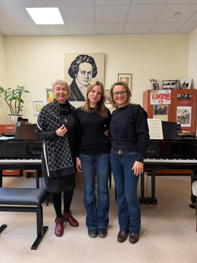 | #ErasmusPlus #hochschulefurmusicundtheaterrostock #yaro Erasmus+ programos dalyvių mobilumas: Trumpalaikis mokinių mokymosi mobilumas. Projekto kodas 2024-1-LT01-KA121-SCH-000220581 Mokymo (dėstymo) veiklos. Projekto kodas 2023-1-LT01-KA121-SCH-000146543 Stebėjimo vizitas. Projekto kodas 2024-1-LT01-KA121-SCH-000220581 Mūsų kelionė į Rostoko muzikos ir teatro akademiją prasidėjo vėlų spalio 19-osios vakarą. Visi drauge keliavome į Klaipėdos centrinį terminalą ir ruošėmės 19 valandų visiškam pasaulio sustojimui. Naktis kelte buvo nerami, jautėme, kaip bangos atsimuša į laivą. Atėjus sekmadieniui laukė karališkas švediškas pusryčių ir pietų stalas, vakarop drauge optimistiškai nusiteikėme įtemptam keliavimui traukiniais į Rostoką. Atplaukus į Kylį, iš laivų terminalo pasiekėme centrinę traukinių stotį, o tada bėgte persėdinėjome iš vieno traukinio į kitą, kol pasiekėme Rostoką. Atvykusius į Rostoką mus pasitiko Auksė Petroni, ji padėjo nusigauti iki mūsų viešbučio, kur po parą trukusios kelionės pagaliau galėjome pailsėti. Pirmadienio rytą keliavome į Rostoko muzikos ir teatro akademiją, kur susipažinome su YARO (Young Academy Rostock) prezidentu ir fortepijono profesoriumi Stephan Imorde. Auksė Petroni mus supažindino su įspūdinga akademijos biblioteka, kur galima rasti viską – nuo Bacho kantatų, Bethoveno sonatų, Liszto etiudų iki Vagnerio operų klavyrų. Taip pat buvo labai malonu susipažinti su vokalo pedagogu, baritonu, prof. Klaus Häger ir stebėti, kaip profesorius dirba su jaunaisiais dainininkais. Pasisekė ir mums! Turėjome didelę garbę išbandyti savo jėgas ir padirbėti su profesoriumi. Buvo įdomi patirtis. Po pamokų stebėjimo visi drauge ėjome pietauti į akademijos valgyklą, kur aptarėme dienos įspūdžius. Vakare akademijos kamerinėje salėje klausėmės įspūdingo pianistės iš Italijos Marcella Crudeli rečitalio. Po pilnos įspūdžių dienos grįžome į viešbutį ilsėtis ir ruoštis ateinančioms dienoms! Įspūdžiais dalinosi IV klasės mokinės Vanesa Bernotaitė ir Šarlotė Viskontaitė Antroji diena Vokietijoje, Rostoke, prasidėjo nors ir lietingai, bet mūsų pianistams – Edvinui ir Matui – darbingai. Vaikinai gavo puikią galimybę sudalyvauti meistriškumo pamokoje pas pianistą profesorių Stephan Imorde, kur įgijo naujų žinių ir kitokio žvilgsnio į savo grojamus kūrinius. Na, o dainininkės tuo tarpu įnirtingai „šildė” balsus pas vokalo dėstytoją docentę Auksę Petroni, kuri padėjo įžvelgti kitokio požiūrio į savo kūną kaip instrumentą. Po pietų turėjome galimybę patekti į koloratūrinio soprano, profesorės Martina Ruping vokalo paskaitą, sėmėmės žinių, pojūčių atliekant skirtingų žanrų kūrinius. Šiandien turėjome antrą galimybę – meistriškumo pamokoje pas vokalo profesorių baritoną Klaus Hager. Mažais žingsneliais jaučiame, kaip augame, plėsdami savo žinių akiratį. Na, o savo turiningą dieną užbaigėme aplankydami įspūdingą šios akademijos magistrantės sukurtą modernią operą „Kelionė į Vakarus”, kurią atliko taip pat šio universiteto studentai. Tai paliko mums didelį įspūdį ir nuteikė mus sekančiai dienai. Trečioji mūsų diena Rostoke. Atsikėlę ryte ir pavalgę pusryčius nusprendėme leistis į miesto gatves, norėdami geriau jį pažinti ir pasinerti į jo atmosferą. Rostokas – miestas su turtinga istorija, todėl kiekvienas žingsnis priminė apie praeities didybę. Aplankėme įspūdingas, milžiniškas bažnyčias, kurių gotikinė architektūra tiesiog užburia. Kiekviena bažnyčia alsavo savo unikaliu žavesiu – nuo didingų vitražų iki akmens sienų, kurios mena šimtmečius. Be bažnyčių apžiūrėjome ir kitus žymius miesto objektus bei lankytinas vietas. Apžiūrėjusios miestą mūsų dainininkės išėjo į akademiją klausytis meistriškumo pamokų pas profesorę McCarthy. Šios pamokos dainininkėms leido pagilinti muzikines dainavimo žinias ir įgūdžius. Kol dainininkės klausėsi pamokų, pianistai puikiai leido laiką akademijos bibliotekoje, studijuodami partitūras ir klausydamiesi žymių atlikėjų įrašų. Dainininkės, įkvėptos meistriškumo pamokų, repetavo ir išbandė naujas technikas su savo mokytoja Giedre Zeicaite. Ši diena buvo laisvesnė nei kitos, tačiau nepaisant to susipažinome su miestu ir puikiai praleidom laiką. Įspūdžiais dalinosi IV klasės mokiniai Sofija Ruginytė, Matas Stabingis ir Edvin Oblačinski Spalio 24–25 dienomis mes – mokiniai – intensyviai ruošėmės šeštadienio koncertui, nes turėsime galimybę savo programą atlikti „Kapitelsaal“ salėje. Nuo pat ryto dainininkės apšildė balsus, o pianistai pirščiukus. Vėliau dirbome su savo mokytojais, o taip pat turėjome galimybę labiau pažinti savo kūną ir teisingai kvėpuodami jį atpalaiduoti. Dainavimo pedagogė doc. Auksė Petroni meistriškumo klasėje rodė kvėpavimo ir kūno atpalaidavimo pratimus, su mumis atliko vokalinės technikos pratimus. Vakare dalyvavome renginyje, skirtame A. Schonberg 150-osioms metinėms. Paskaitoje-koncerte buvo labai netradiciškai pristatyta kompozitoriaus asmenybė. A. SCHONBERG asociacijos Vienoje atstovai pasakojo, kokias vykdo veiklas. Penktadienio rytas pianistams prasidėjo meistriškumo pamoka pas fortepijono pedagogą prof. Zack. Klasikinius kūrinius vokiečių profesorius interpretavo pabrėždamas tikslumą ir agogiką. Dar daugiau suvokimo apie muziką ir jos grožį mums suteikė apsilankymas Volkstheater Rostock, G. Puccini operoje „Tosca”. Kai kuriems iš mūsų tai buvo pirmoji opera ir tikiu, kad ji tikrai paliks neišdildomus įspūdžius. Jau po pirmo veiksmo visi iš salės išėjome žibančiomis akimis, o jai pasibaigus negalėjome sustoti dalintis įspūdžiais. Noras taip uždainuoti užvaldė visas mūsų vokalistes, todėl manau, kad šiandienos koncerto met