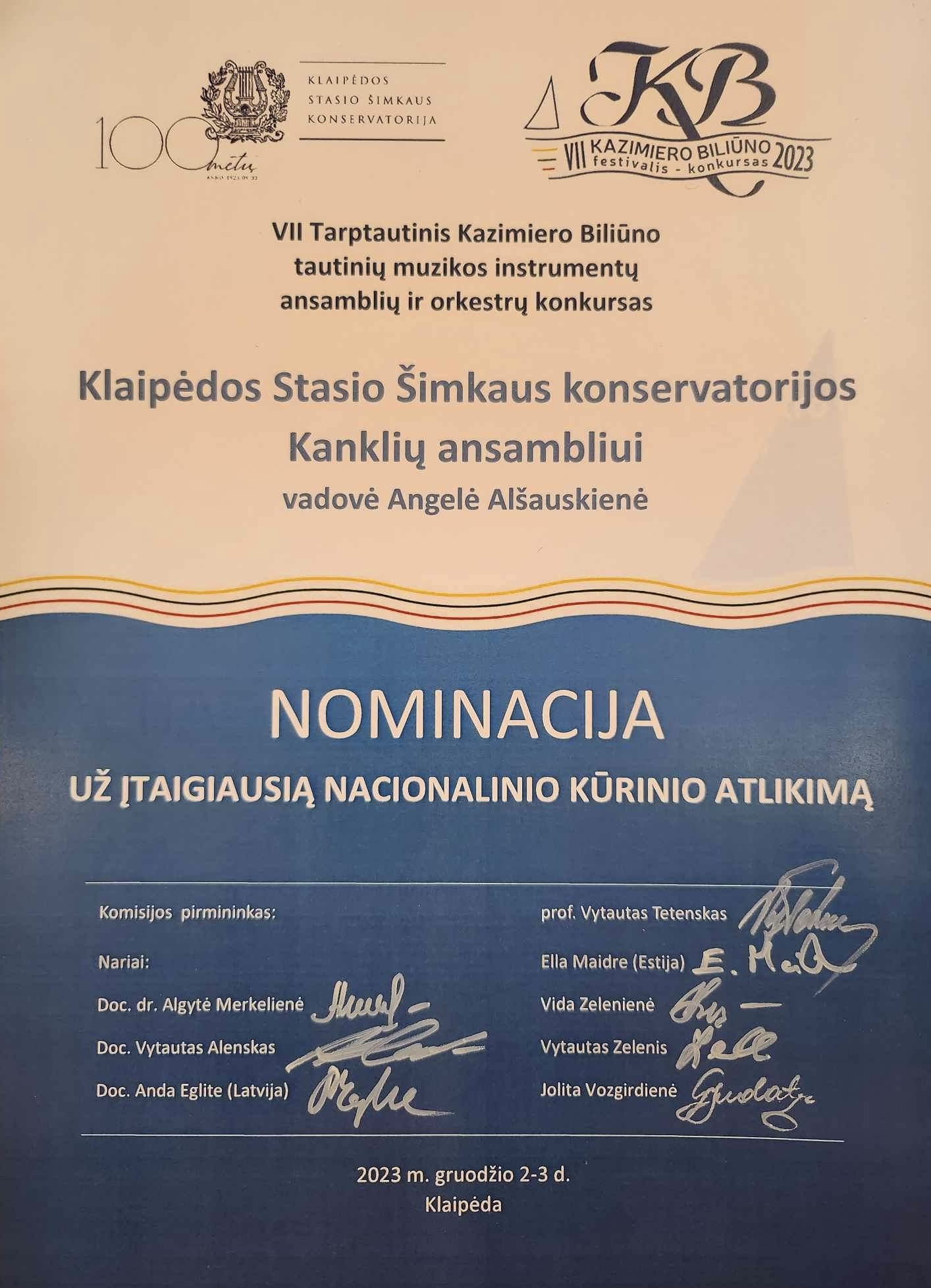 2023-12-02/03 dienomis Klaipėdoje vyko konservatorijos tautinių instrumentų klasės mokytojų Angelės Alšauskienės, Gintaro Jonaičio, Anatolijaus Tumanovo, Ingridos Kurienės bei tautinių instrumentų asociacijos „Trimitatis” organizuotas VII tarptautinis Kazimiero Biliūno tautinių instrumentų ansamblių ir orkestrų festivalis-konkursas.