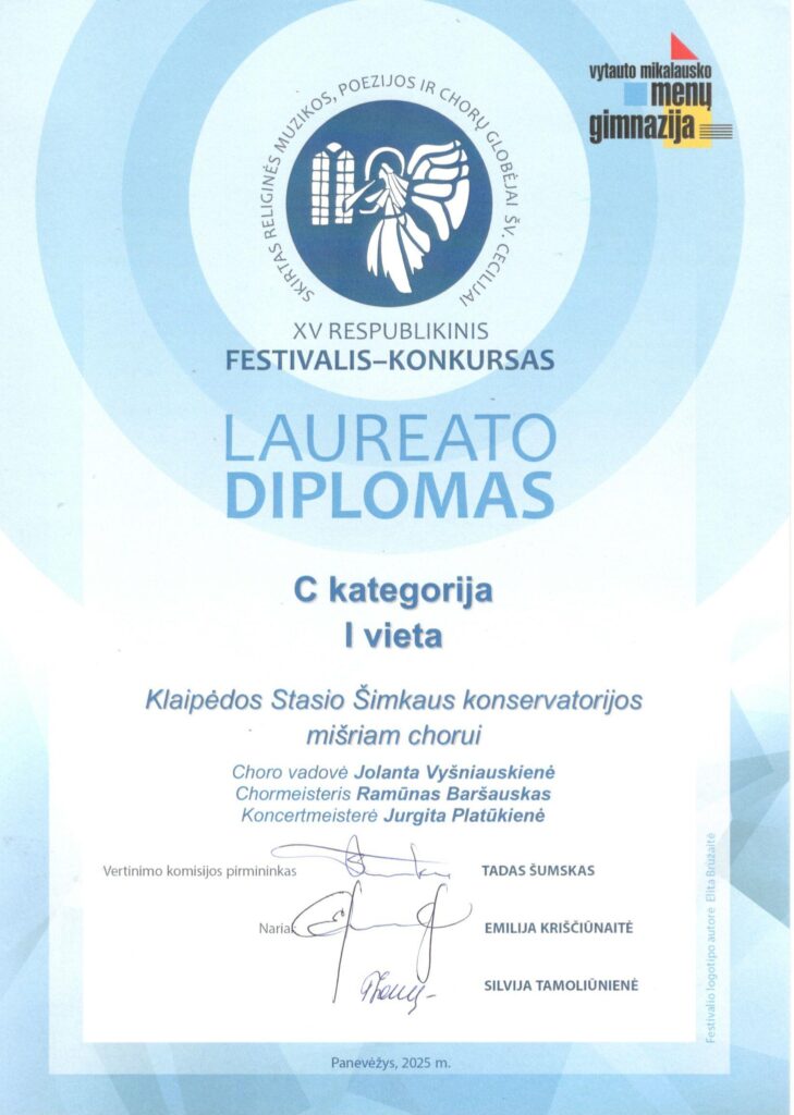 | Sveikiname Konservatorijos mišrų chorą, jo vadovę Jolantą Vyšniauskienę, chormeisterį Ramūną Baršauską, koncertmeisterę Jurgitą Platūkienę laimėjus I vietą XV respublikiniame festivalyje-konkurse, skirtame religinės muzikos, poezijos ir chorų globėjai šv. Cecilijai! |