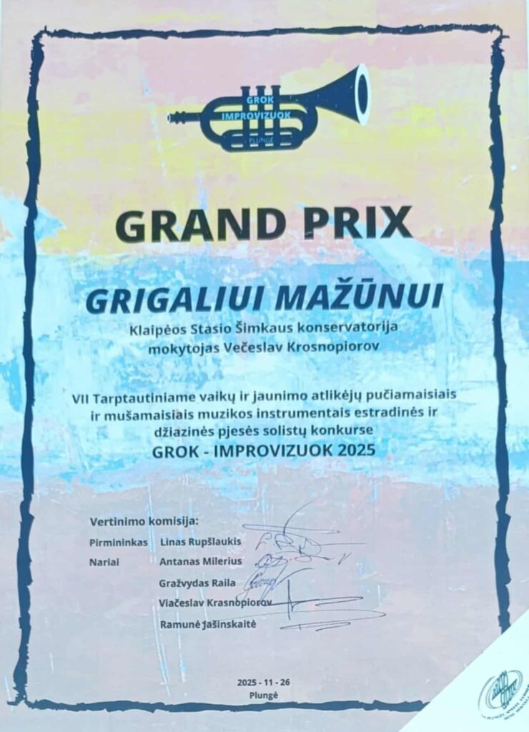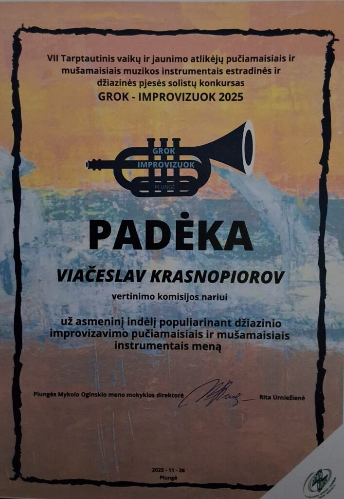 | 2025-11-26 dieną mušamųjų instrumentų specialybės mokinys Grigalius Mažūnas (mokytojas V. Krasnopiorov) dalyvavo Plungės Mykolo Oginskio meno mokyklos VII Tarptautiniame vaikų ir jaunimo atlikėjų pučiamaisiais ir mušamaisiais muzikos instrumentais estradinės ir džiazinės pjesės solistų konkurse ”Grok-Improvizuok 2025” ir tapo Grand Prix laimėtoju. |
