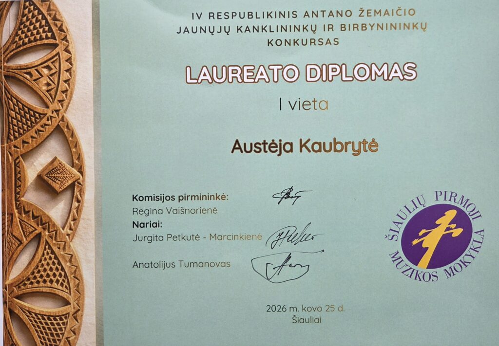 | Kovo 25 d. IV klasės kanklininkė Austėja Kaubrytė dalyvavo IV respublikiniame Antano Žemaičio jaunųjų kanklininkų ir birbynininkų konkurse Šiaulių 1-oje muzikos mokykloje. D grupėje Austėja pelnė I vietos laureato diplomą. Loreta Tumanovienė. |