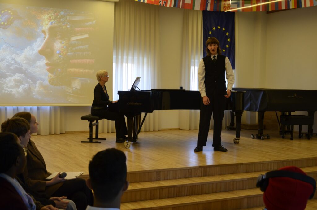 Penktadienio rytą (rugsėjo 25 dieną) mūsų Elzė, Neressa, Igoris ir Austėja visus, atėjusius į Konservatoriją, kalbino ir įkvėpė išreikšt savo jausmus bei nuotaikas per Europos kalbų dienos prizmę, kviesdami paminėti šią dieną prie nebylaus maestro Stasio Šimkaus biusto. Jis buvo trumpo, bet skambaus paminėjimo dalimi – jo metu Kamilės, Godos, Tomos bei Elzės auksiniai balsai įprasmino Europos kalbų dieną vokiečių, italų, lietuvių bei rusų kalbomis per pagrindinę mūsų Europos kalbą – MUZIKĄ! Labai ačiū mokytojai Rūtai Agafonovienei ir koncertmeisterėms Ievai Šličiuvienei, Virginijai Ruzgienei ir mokinei Saulei Norvaišaitei.
